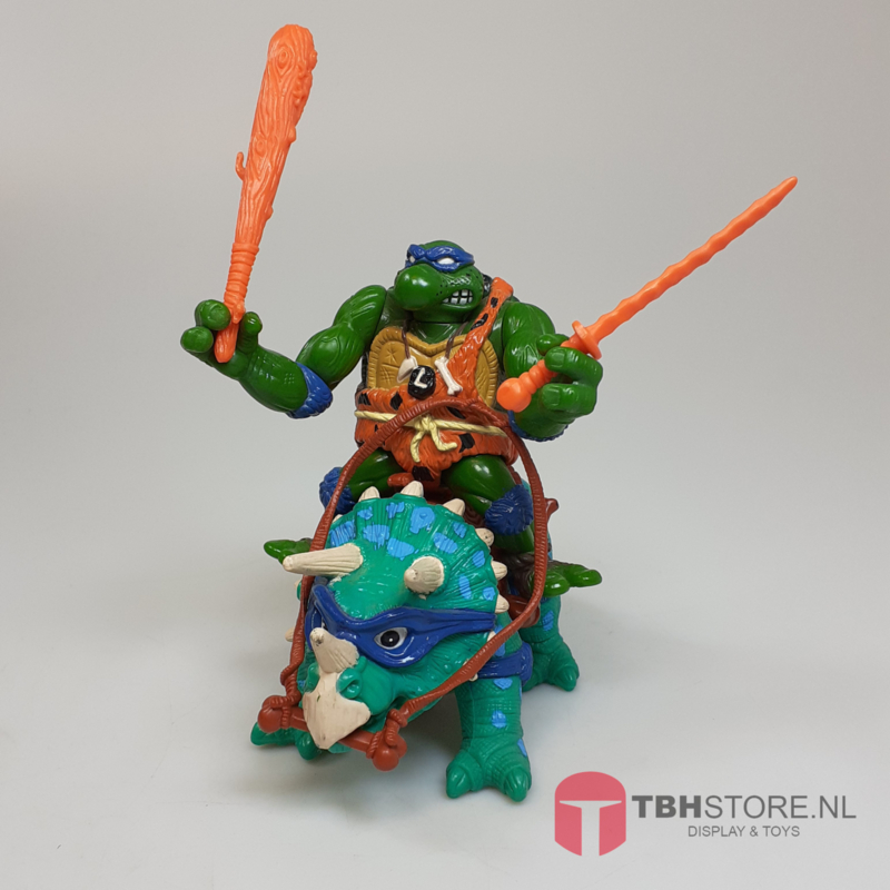 Bijzonderheden: De Cave-Turtle Leo and His Dingy Dino kwam in 1993 uit binnen de Prehistoric Turtles lijn van Playmates. In deze subserie kregen de Turtles een oertijd-make-over, compleet met knotswapens, dierenhuiden en natuurlijk hun eigen dino’s. Leo kreeg een bruin leren look met beenbescherming van botten en een enorme knuppel als wapen. Zijn rijdier, de Dingy Dino, had een speelse, cartooneske uitstraling met een harnas waar Leo bovenop kon zitten. Dit zorgde voor een van de meest opvallende en fantasierijke releases van de jaren 90.