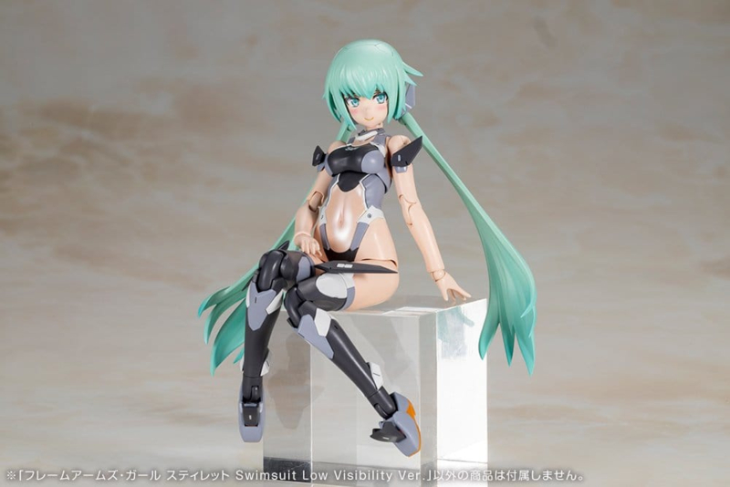 STYLET Swimsuit Ver. deploys in low visibility colors!This kit is a variation on Stylet Swimsuit Ver. from Kotobukiya's original series Frame Arms Girl in a brand-new low visibility color scheme.This model is brought to life based on Humikane Shimada's bishoujo-style character illustration of Takayuki Yanase's Frame Arms design!Model Specifications:- Includes three all-new pre-painted face parts (modest smile, shouting smile, surprised).- The main body color and color separation have been changed to low visibility colors, making it easy to combine with M.S.G items.- Hair color has been changed to green.- The swimsuit has an aerodynamic high cut design and features new equipment such as multiple sets of wings around the body and new headgear.- Includes a liquid cartridge smart gun.- Includes a submachine gun.- The elbows are double-jointed, allowing for a better range of motion.- The armored legs and other parts of the original Stylet (sold separately) are compatible for easy customization.- The new bangs parts can be used with or without the new headgear.- Also, the kit comes with a range of items that were included with Innocentia, such as cat ears, mecha cat ears, mecha fox ears, mecha pointed dog ears, mecha floppy dog ears, and mecha accessories, in addition to newly-sculpted black mecha cat ears.- Includes five new PVC hands with ball joints for each arm.- The back booster can be reconfigured into fighter jet mode.- Includes decals for the eyes and other markings.- The PVC hands are compatible with existing weapons from other series, including M.S.G and Frame Arms.- The fins of the thighs use 3mm connection joints, and other parts from existing series, including M.S.G and Frame Arms, can also be attached.- 3mm joint parts can be attached to the smart gun and submachine gun.What is Frame Arms Girl?Frame Arms Girl is a spin-off of Kotobukiya's original model kit series, Frame Arms, that creates a bishoujo-style character for each mecha.The kits come with multi-colored parts and face parts pre-printed with tampography, making them easy to assemble with no paint required.Equipped with the signature 3mm joints and PVC hands from Frame Arms, Frame Arms Girl models can be combined with a variety of parts from series such as M.S.G (Modeling Support Goods), Frame Arms, and more!The latest models' heads, arms, and legs in the series are fully compatible with each other, so users can create their very own unique Frame Arms Girl!"