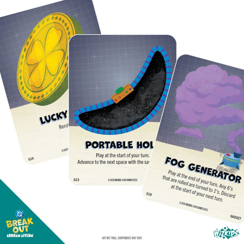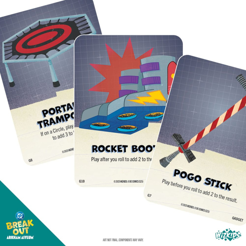 Make a mad dash out of Arkham Asylum ™ - again! You've broken out before, so to make it more interesting, you've challenged your fellow rogues of Gotham City™ to a race to freedom. Can you make your daring getaway before your opponents? DC Breakout: Arkham Asylum™ is a thrilling race to freedom designed by Geoff Englestein and his children, Brian and Sydney. With a variety of iconic Villains from your favorite Batman series, there are hundreds of possible duos to play! Use your villainous powers and gadgets to gain the upper hand over your rivals. Find out what happens when you pair up your favorite diabolical duo as you race to victory! Recruit, outwit, and escape in DC Breakout: Arkham Asylum™! Product Highlights: - With 40 Villains to pick from, there is a plethora of possible pairings to play! - Grab-and-go gameplay created by a family, for families. - Discover vibrant, eye-catching original art crafted by Ryan Goldsberry. Contents*: - 11 Map Tiles - 40 Villain Cards - 32 Gadget Cards - 40 Hench Tokens - 40 Villain Standees - 2 Dice *final images and contents subject to change