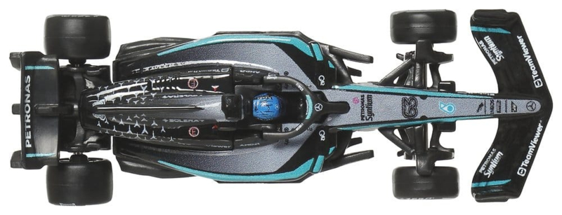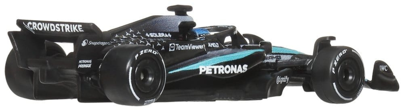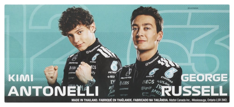 With this Hot Wheels Premium Mercedes-AMG PETRONAS F1 Team 2-Pack, any Hot Wheels collection shifts into turbo gear. The set includes 1:64 scale die-cast race cars inspired by the models driven by George Russell and Kimi Antonelli. Each car features authentic liveries with realistic front wings and side pods, as well as detailed driver helmets. The metal body and chassis, along with Real-Riders tires, highlight the high-quality craftsmanship of the cars. With special packaging and an individual display base, both drivers score points. Color and design may vary.