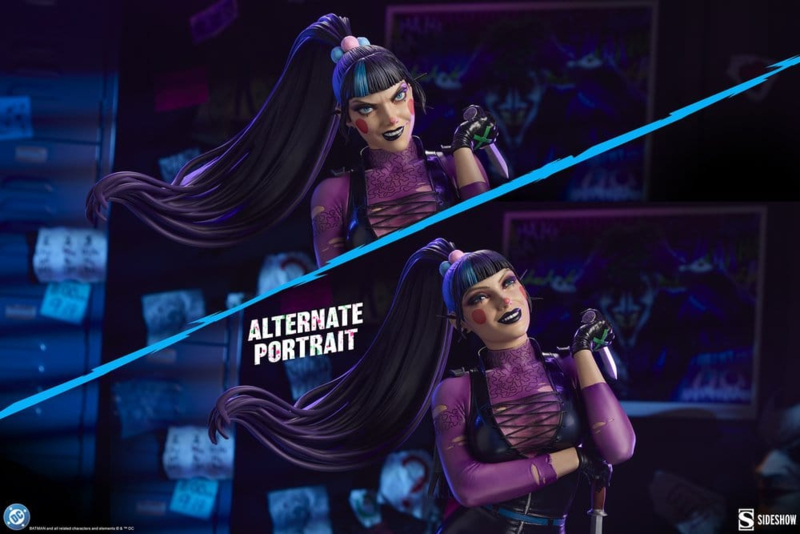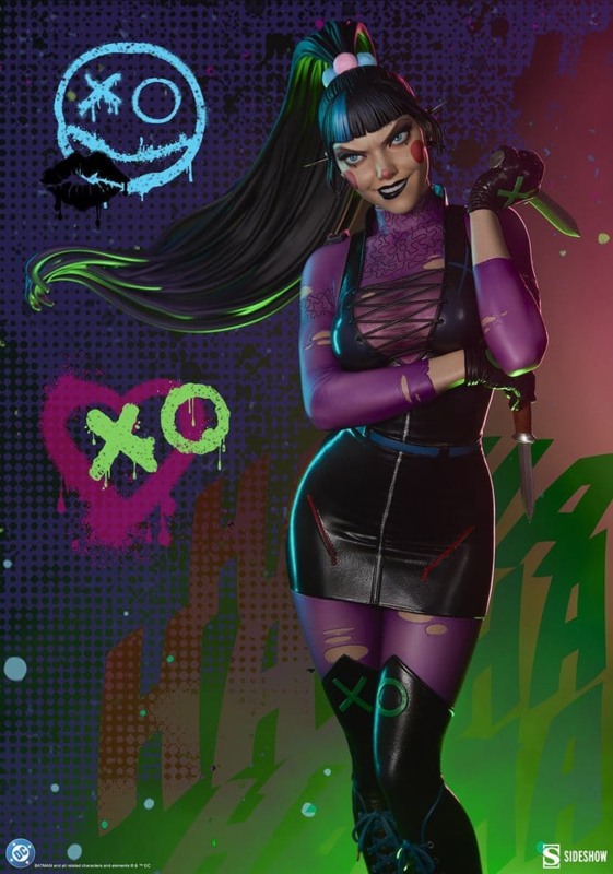 Sideshow and Warner Bros. Discovery Global Consumer Products (WBDGCP) present the Punchline⢠Premium Format⢠Figure. This officially licensed DC-themed collectible paints a cunning clown groupie in a chaotic, colorful light. Itâs a mad world, and sheâs the solution. The Punchline Premium Format⢠Figure measures 21.75 inches (55.2 centimeters) tall, 11.14 inches (28.2 centimeters) wide, and 8.1 inches (20.5 centimeters) deep as Alexis Kaye carves out a place for herself within the coterie of Gotham City baddies. Both a lover and a hater, she takes her costume and makeup cues from The Joker⢠while torturing torn toy versions of Harley Quinn⢠and Batman⢠â hey, every fangirl needs a hobby. Inspired by the characterâs appearance in The Joker War story arc, this fully sculpted comic book collectible depicts Punchline in a ripped purple bodysuit, black dress and corset bodice, knee-high black boots, and a small black cape. She wields her preferred weapon in her right hand while standing upon a circular pedestal resembling wooden baseboard and tarnished brass. The quarter scale DC statue includes two portraits: one neutral and enigmatic, the other devious, revealing the pleasure Punchline derives from her Super-Villain status. Each expression is accompanied by a long, high ponytail streaked by vivid blue. Radicalize your shelf and bring home the Punchline Premium Format⢠Figure by Sideshow today!Product Size: 55 x 28 x 21 cm (21.75" H x 11.14" W x 8.1" L)