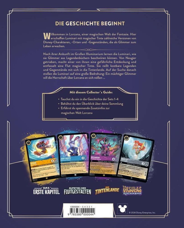 Welcome to Lorcana, a magical world of fantasy! After arriving in Lorcana, the Luminari learn how to summon Glimmers. Driven by curiosity, one of them unleashes a flood of magical ink. It sweeps precious treasures with it into the Inklands. In their search, the Luminari encounter a great threat. This first Collector's Guide tells the story of the game and includes an overview of all cards from sets 1 to 4 - the perfect companion to the Disney Lorcana Trading Card Game for collectors, players, and Disney fans! Disney Lorcana is a popular trading card game where players experience exciting adventures with their favorite Disney characters. But it's more than just a game: in the magical world of Lorcana, stories await at every corner. Here, Luminari use magical ink to summon countless Glimmers of beloved Disney characters, places, and items, and embark on adventures to protect and preserve the stories in Lorcana. The official Collector's Guides to the Lorcana TCG combine these stories with exciting Easter eggs and an overview of all cards from a year. The first volume contains the stories and a card catalog of these sets: "The First Chapter", "Rise of the Floodborn", "Into the Inklands", "Ursula's Return" and "Illumineer's Quest: Deep Trouble". More info at disneylorcana.com