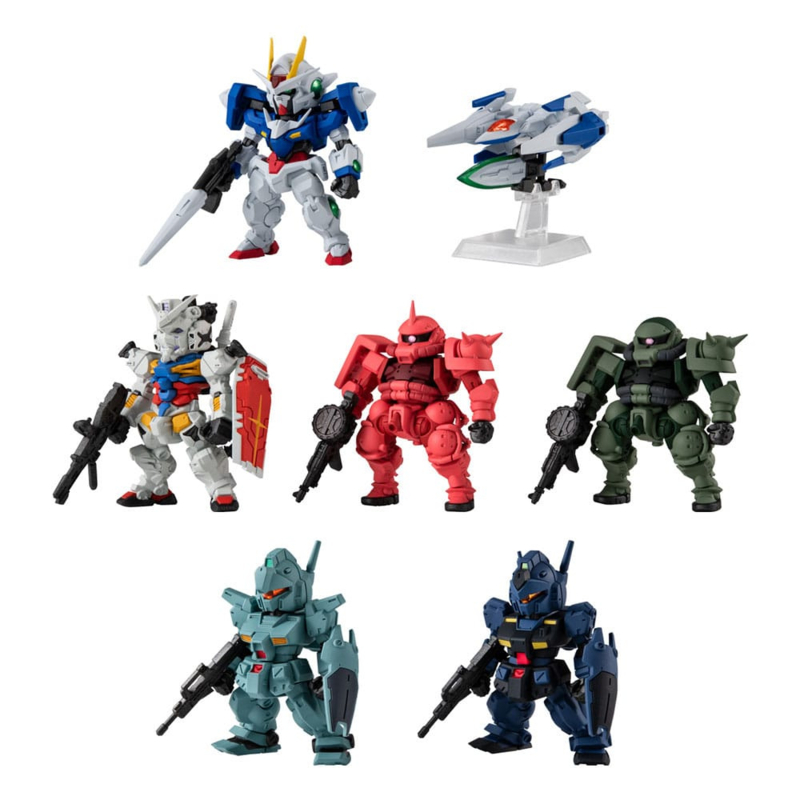 2.3-inch tall articulated Mobile Suit figures with display stands and accessories. The 28th series features Mobile Suits from the second season of Gundam 00, newest series GQuuuuuuux, and second OVA series 0083 Stardust Memory.