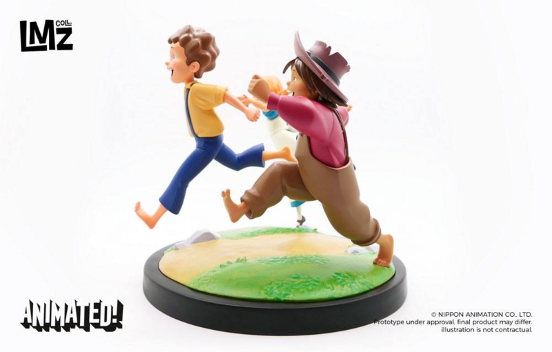 Join Tom, Huck and Becky in a wild chase that the mischievous Mark Twain would not have denied.Created in 1980 by the NIPPON ANIMATION studio and directed by Hiroshi Saito, this television series which made the heyday of the show "Récré A2" in France, is inspired by the great classic of American literature to develop children's stories, each more exciting than the next.Friendship, carelessness, love, the happiness of childhood, all of these themes that we have tried to suggest for you with our leaping and joyful little heroes. So, if you don't mind, hand in hand and heart in celebration, let's run together, barefoot, to the shores of the Mississippi river !Molded, assembled and hand painted.Limited to 300 units.Product size: 23 x 25 x 28 cm