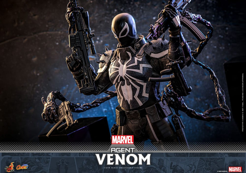 Flash Thompson grows up to join the army but loses his legs in combat. Bonding with the Venom symbiote allows him to walk again while in the suit, and he also becomes Agent Venom for the government. Possessing powers similar to Spider-Man's, he gains superhuman abilities and the ability to generate webbing. Sideshow and Hot Toys are excited to present this new Agent Venom Sixth Scale Collectible Figure, which is sure to give your display a remarkable upgrade. Meticulously crafted based on Marvel Comics, the Agent Venom action figure features a newly crafted head sculpt with interchangeable eye pieces, a specialized body that naturally portrays Agent Venom's muscular physique, a symbiotic armor with spikes showcasing a military theme, an interchangeable symbiotic blade forearm, two styles of tendrils attachable to figure's back, two strings of webbing accessories, a series of firearms including sniper rifle, machine gun, submachine guns, pistols, and lastly a specially designed figure base with the character's name. Cue the epic comic battles with the Agent Venom Sixth Scale Figure that will take your Marvel Comics collection to the next level.