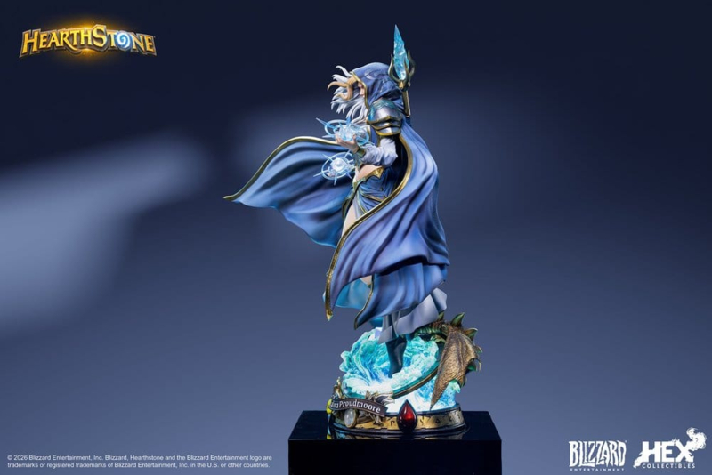 "My magic will tear you apart!"Sideshow, HEX Collectibles, and Blizzard Entertainment are thrilled to present the Jaina Proudmoore 1:6 scale statue, bringing the card art from the game into the real world, fully showcasing the Daughter of the Sea with stunning details.Hovering above the crashing waves, Jaina channels arcane energy with both hands. Her stern expression and piercing gaze are sculpted with precision, perfectly capturing her resolute determination of the Archmage. Her iconic silver-white hair billows in the wind, with the signature streak of blonde faithfully recreated, freezing the breathtaking moment of her spellcasting in time.Beneath her feet, surging waves converge into a swirling vortex base. Sculpted with translucent resin and featuring built-in LED lighting with two selectable modes-dynamic breathing and continuous illumination, the base glows with arcane power, vividly recreating the visual impact of surging magical energy. A dragon emerges from the waves, coiled along the edge of the base, paying tribute to the legendary card frame in game. Iconic elements such as Attack value, Health value, and the Mana Crystal adorn the front, imbuing the statue with an epic atmosphere.Each statue comes with a certificate of authenticity, complete with a handwritten unique number, adding to its collectible value.Just like the brand concept of HEX Collectibles, our team has always looked at ways to push the boundaries of design and capture the essence of each character we love. HEX Collectibles will continue to bring beloved characters to life with our dynamic style of design.Hearthstone® fans, don't miss your chance to add this Jaina Proudmoore statue to your Warcraft collection today!Size: 38,6 x 29 x 20,1 cm (15.2" x 11.4" x 7.9")