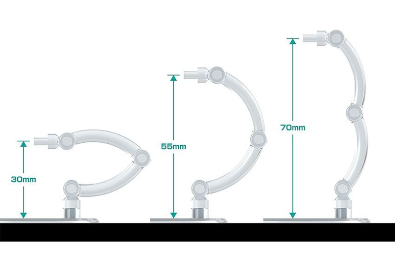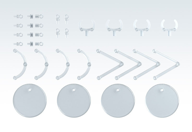 Perfect stands for figures around 10cm in height! A set of 4 transparent stands. The stands work great with Nendoroid figures!Presenting a set of 4 simple and affordable display stands! These stands, perfect for small figures around 10cm in height, feature a plain, transparent design. The support arm is equipped with a 3mm pin for connecting to holes of corresponding size. Attachable clamp-style parts and hexagonal pin parts for Nendoroid figures* are also included. The stands are made with transparent ABS resin. The diameter of each base is around 6cm. Two types of support arms-a curved type and straight type-are included. The curved support arm can be adjusted from 3 to 7cm in height, while the straight support arm can be adjusted from 4.5 to 10.7cm in height.*May not be compatible with some products.