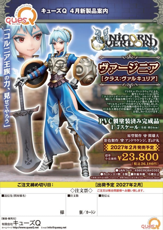 This detailed PVC statue of Virginia (Class Valkyria) from Unicorn Overlord is a great addition to any collection. It is manufactured by QuesQ and is officially licensed.