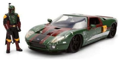 Die-cast vehicle model of the 2005 Ford GT in 1:24 scale with a Boba Fett design. The model features freewheeling, opening doors, trunk, and hood. Includes a die-cast Boba Fett figure.