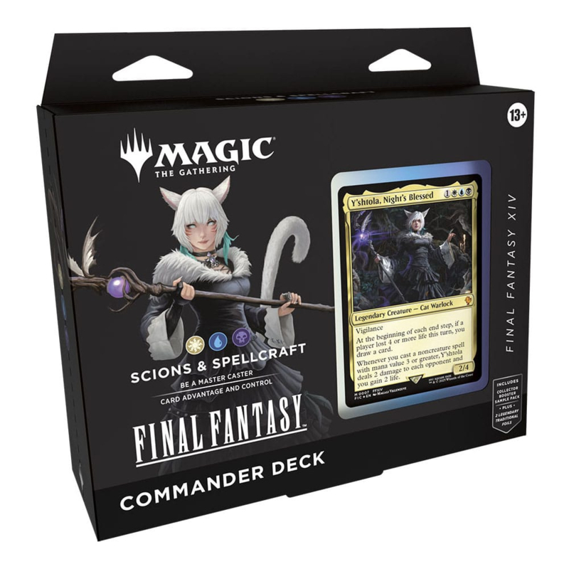 The entire FINAL FANTASY saga is here! Your players will step into the worlds of the beloved FINAL FANTASY RPG series' sixteen mainline games with a Commander deck mainly featuring cards from FINAL FANTASY VI, FINAL FANTASY VII, FINAL FANTASY X, and FINAL FANTASY XIV. They'll cast powerful spells, call upon classic summons, and even visit their favorite locations on the back of a Chocobo. Countless elements from the games are here for players to weave together their own stories.In Commander, four players come together to show their strength and strategy, with one player coming out on top. Each 100-card ready-to-play Magic: The Gathering®-FINAL FANTASY Commander Deck makes it easy for Commander fans in your store to grab a deck and play right away.With brand-new art for reprints and 25 new-to-Magic cards in each deck, FINAL FANTASY fans can experience the games featured for each deck in a whole new way.Contents:1 ready-to-play deck of 100 Magic cards (2 Traditional Foil Legendary cards, 98 nonfoil cards)2-card Collector Booster Sample Pack25 new-to-Magiccards in each deck10 double-sided tokens in 3 of the decks; one deck will contain 6 double-sided tokens and 4 punch-out counter cards1 deck box (can hold 100 sleeved cards)1 strategy insert1 reference cardPlease note: For this item, demand is expected to be higher than the available quantity, which may result in allocations or cancellations of quantities ordered.Please note that we can only ship release items on time for the release date if the net value of your release order exceeds the valid postage allowance for your destination country.